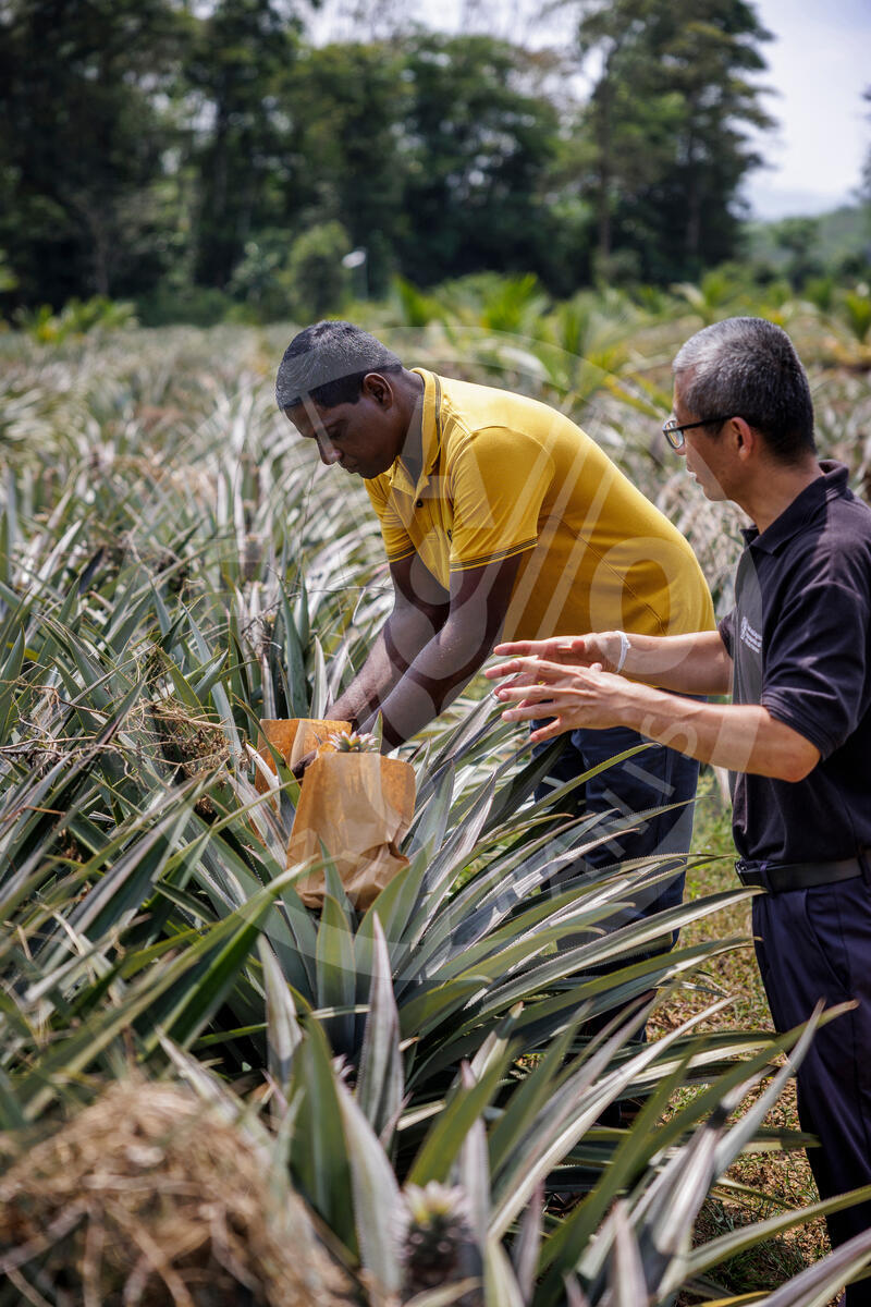 18 February 2025. Horana, Sri Lanka. BHS Lakmal (L), a pineapple farmer, and Jifeng Li (R), a Chinese agriculture expert advisor, cover pineapples with paper protection against pests and the elements, as the fruit approach harvest time.