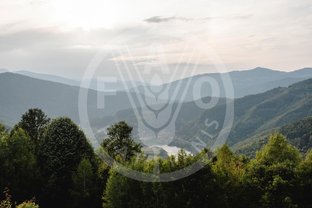28 July 2025, Bajina Basta municipality, village Svojdrug, Republic of Serbia. A view from the village of Svojdrug on the Drina River and Bosnia and Herzegovina (left) and Serbia (right).