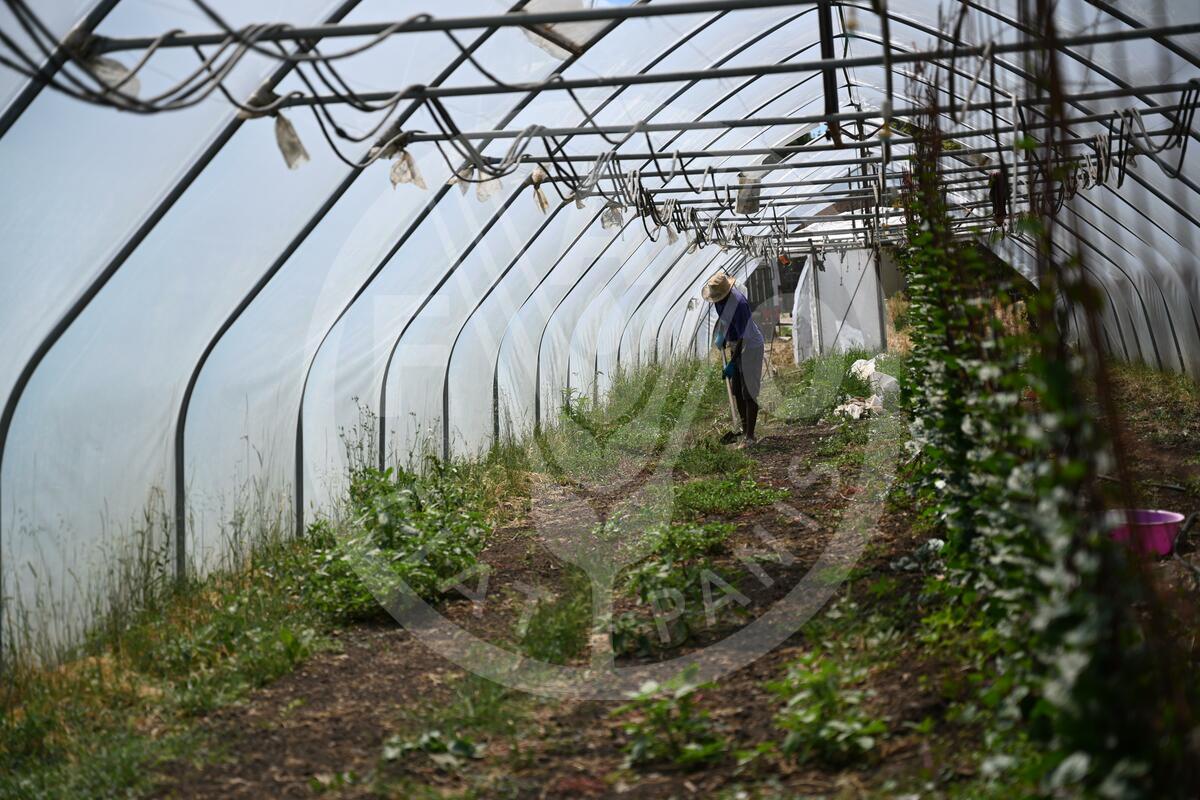 22 July 2025. Zsámbék, Hungary. A farm employee at work in a greenhouse at a smallholder organic farm in Hungary, hoeing the soil around freshly planted vegetables.
