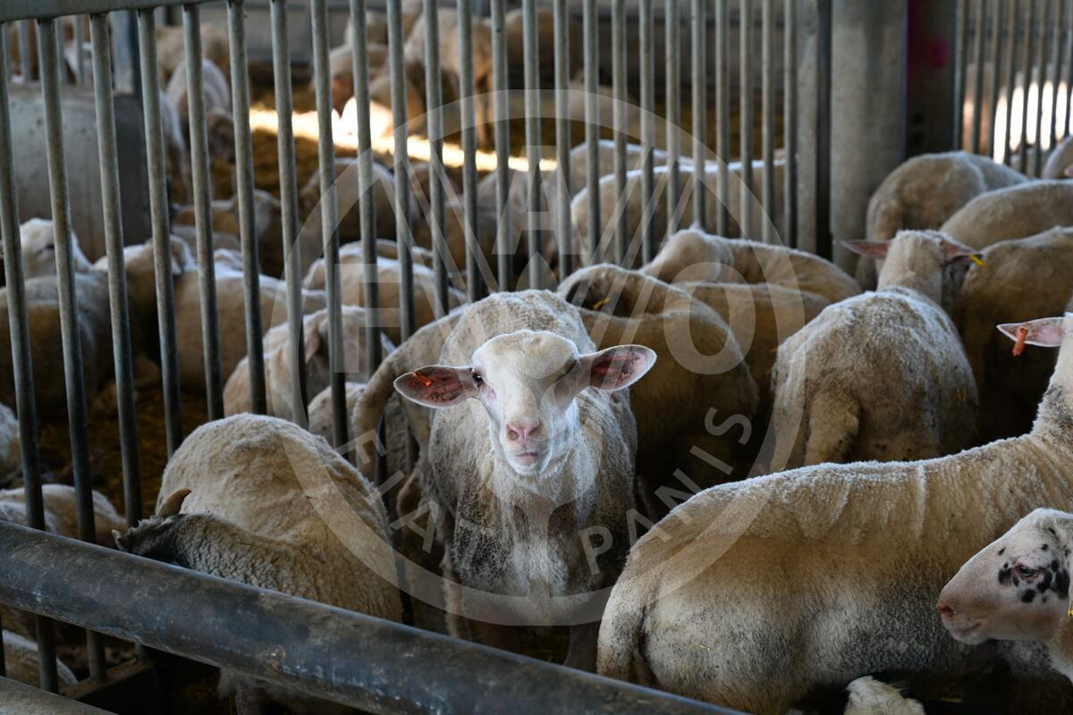 22 July 2025. Alsórádapuszta, Hungary. Several sheep stand together in a pen at the Hunland Trade livestock farm in Hungary. Hunland is the biggest livestock exporter company in the country with modern farm facilities for cattle, pig, and sheep.