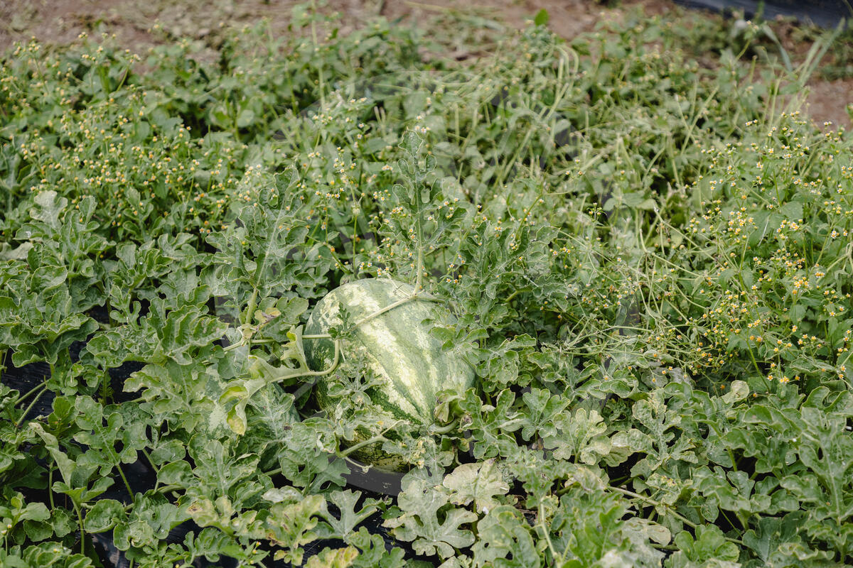 28 July 2025, Valjevo, village Kovačice, Republic of Serbia. Watermelon plants planted in plastic mulch to retain soil moisture and suppress weeds, along with a drip irrigation system for efficient water use and targeted root zone watering.