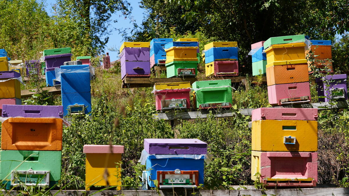 12 August 2025. Güven Village, Düzce, Türkiye. Colourful wooden beehives placed on elevated stands at a hillside apiary in Duzce.