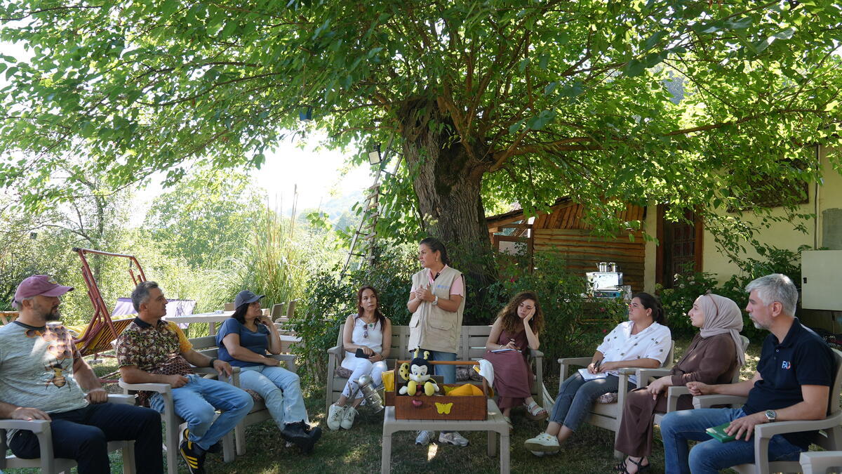 12 August 2025. Güven Village, Düzce, Türkiye. An FAO consultant (C) explains beekeeping practices and rural development to participants during a training course.