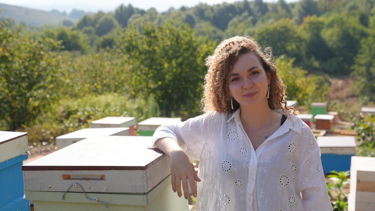 13 August 2025. Tepeköy Village, Akçakoca, Türkiye. Beekeeper Züleyha Ceylan stands near her beehives, posing for a portrait that highlights her role as a young female beekeeper.