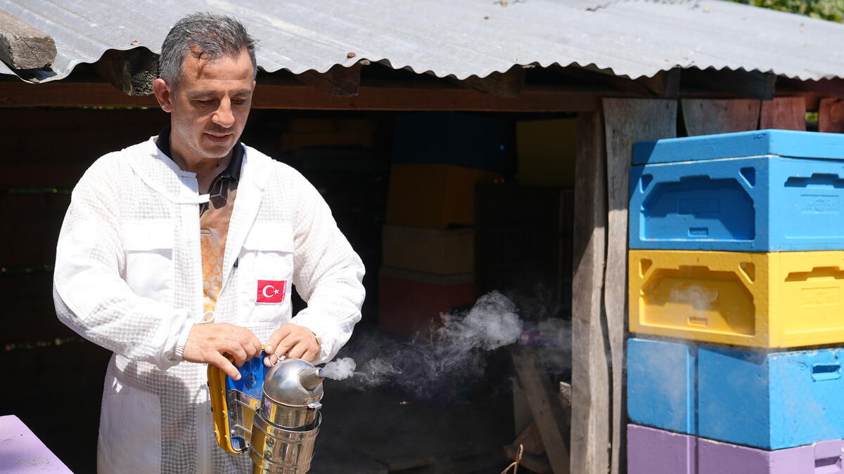 14 August 2025. Güven Village, Düzce, Türkiye. Beekeeper Mücahit Kılıç holds a smoker releasing smoke to calm bees at the entrance of his apiary.