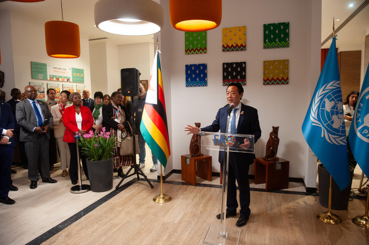 13 October 2025, Rome, Italy. FAO Director-General QU Dongyu and Zimbabwe Minister Agriculture, Fisheries, Water & Rural Development Anxious Jongwe Masuka inaugurate the new Zimbabwe Lounge. World Food Forum (WFF) 2025. The fifth edition of the World Food Forum (WFF), the largest annual gathering of agrifood systems stakeholders globally, runs at FAO headquarters in Rome from 10 to 17 October 2025. FAO Headquarters. (Zimbabwe Lounge).