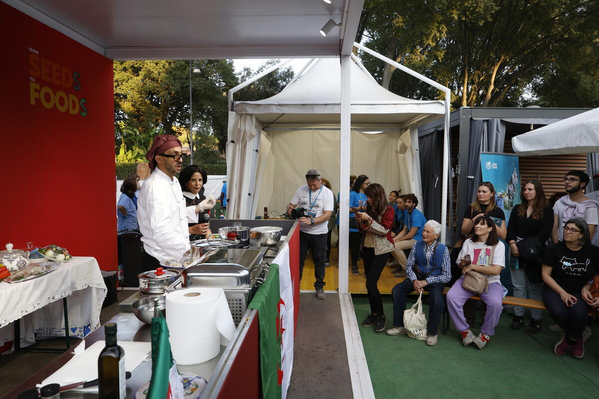 12 October 2025, Rome, Italy. Cooking demonstration and tasting of a traditional dish from Algeria led by Chef Sofiane Ben Cherifa, Algeria. FAO Global Exhibition: From Seeds to Foods. (Porta Capena Park). World Food Forum (WFF) 2025. The fifth edition of the World Food Forum (WFF), the largest annual gathering of agrifood systems stakeholders globally, runs at FAO headquarters in Rome from 10 to 17 October 2025.