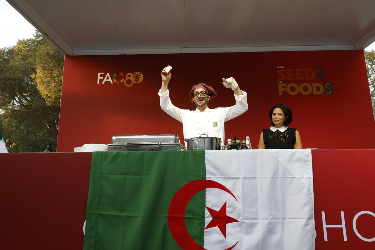 12 October 2025, Rome, Italy. Cooking demonstration and tasting of a traditional dish from Algeria led by Chef Sofiane Ben Cherifa, Algeria. FAO Global Exhibition: From Seeds to Foods. (Porta Capena Park). World Food Forum (WFF) 2025. The fifth edition of the World Food Forum (WFF), the largest annual gathering of agrifood systems stakeholders globally, runs at FAO headquarters in Rome from 10 to 17 October 2025.