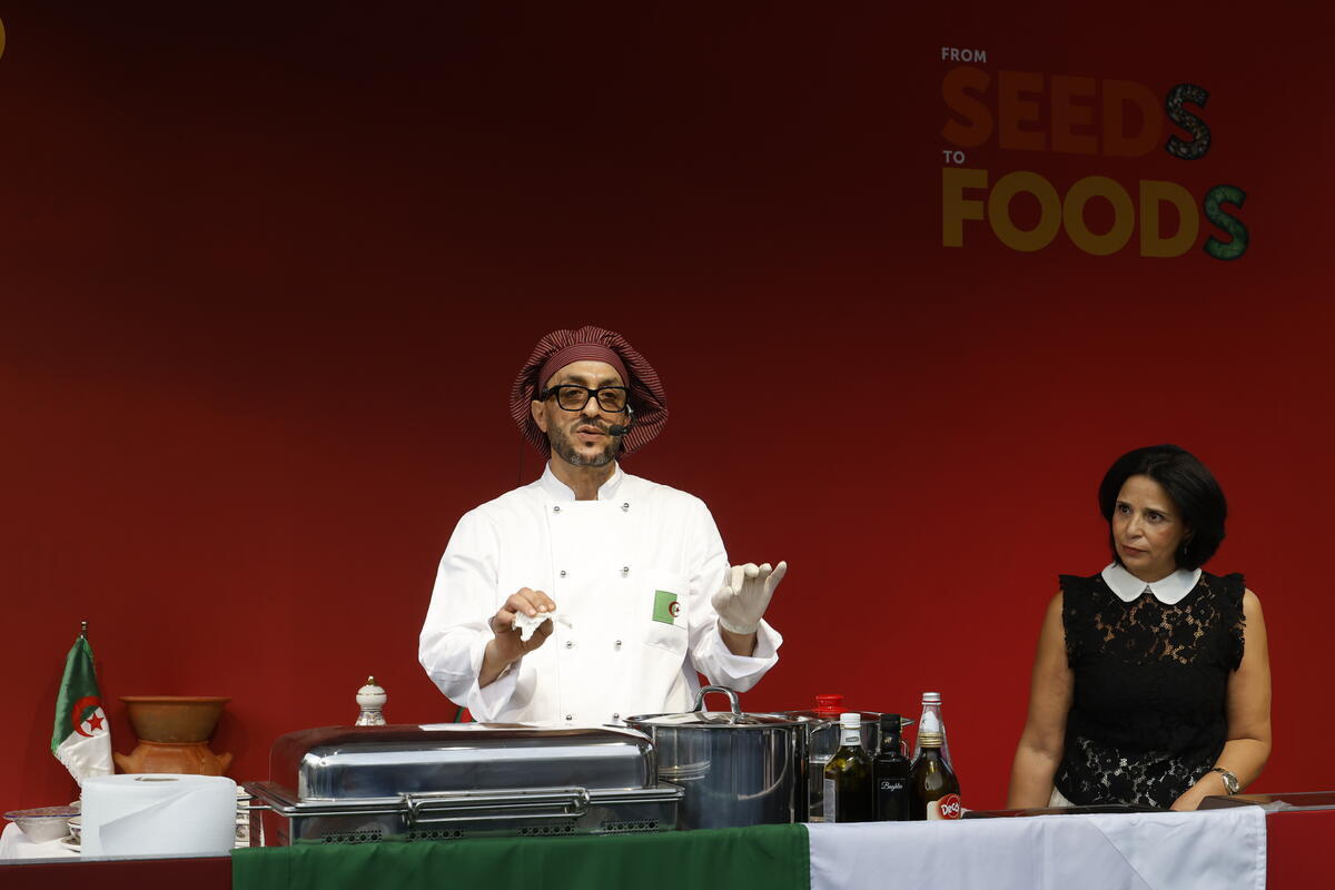 12 October 2025, Rome, Italy. Cooking demonstration and tasting of a traditional dish from Algeria led by Chef Sofiane Ben Cherifa, Algeria. FAO Global Exhibition: From Seeds to Foods. (Porta Capena Park). World Food Forum (WFF) 2025. The fifth edition of the World Food Forum (WFF), the largest annual gathering of agrifood systems stakeholders globally, runs at FAO headquarters in Rome from 10 to 17 October 2025.
