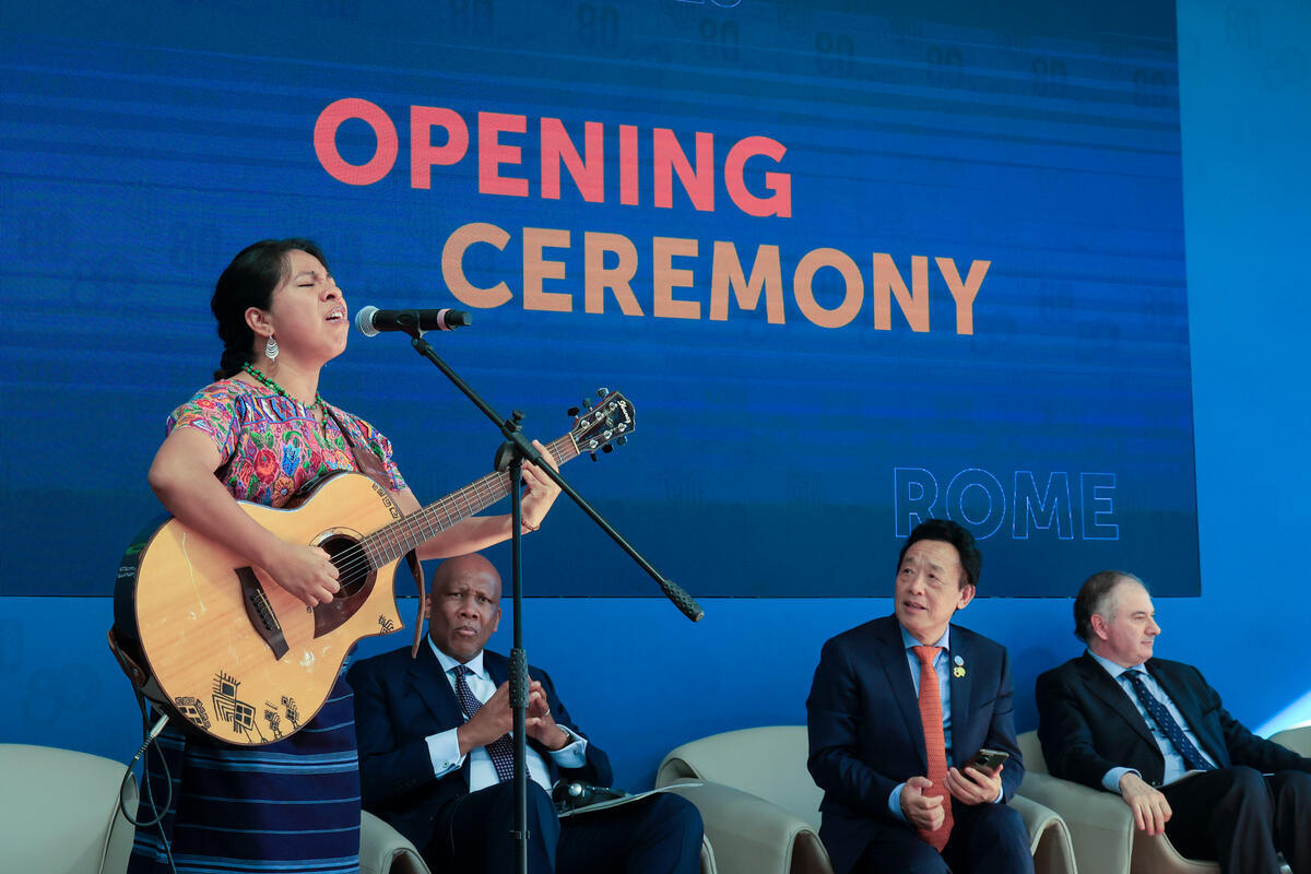 10 October 2025, Rome, Italy. From left to right, Sara Curruchich, 2025 World Food Forum Singer of the Year, His Majesty Letsie III, King of Lesotho, FAO Director-General QU Dongyu and Permanent Representative of Italy to the United Nations Organizations in Rome Bruno Archi. High-level opening of the FAO Global Exhibition: From Seeds to Foods. (Porta Capena Park). World Food Forum (WFF) 2025. The fifth edition of the World Food Forum (WFF), the largest annual gathering of agrifood systems stakeholders globally, runs at FAO headquarters in Rome from 10 to 17 October 2025.