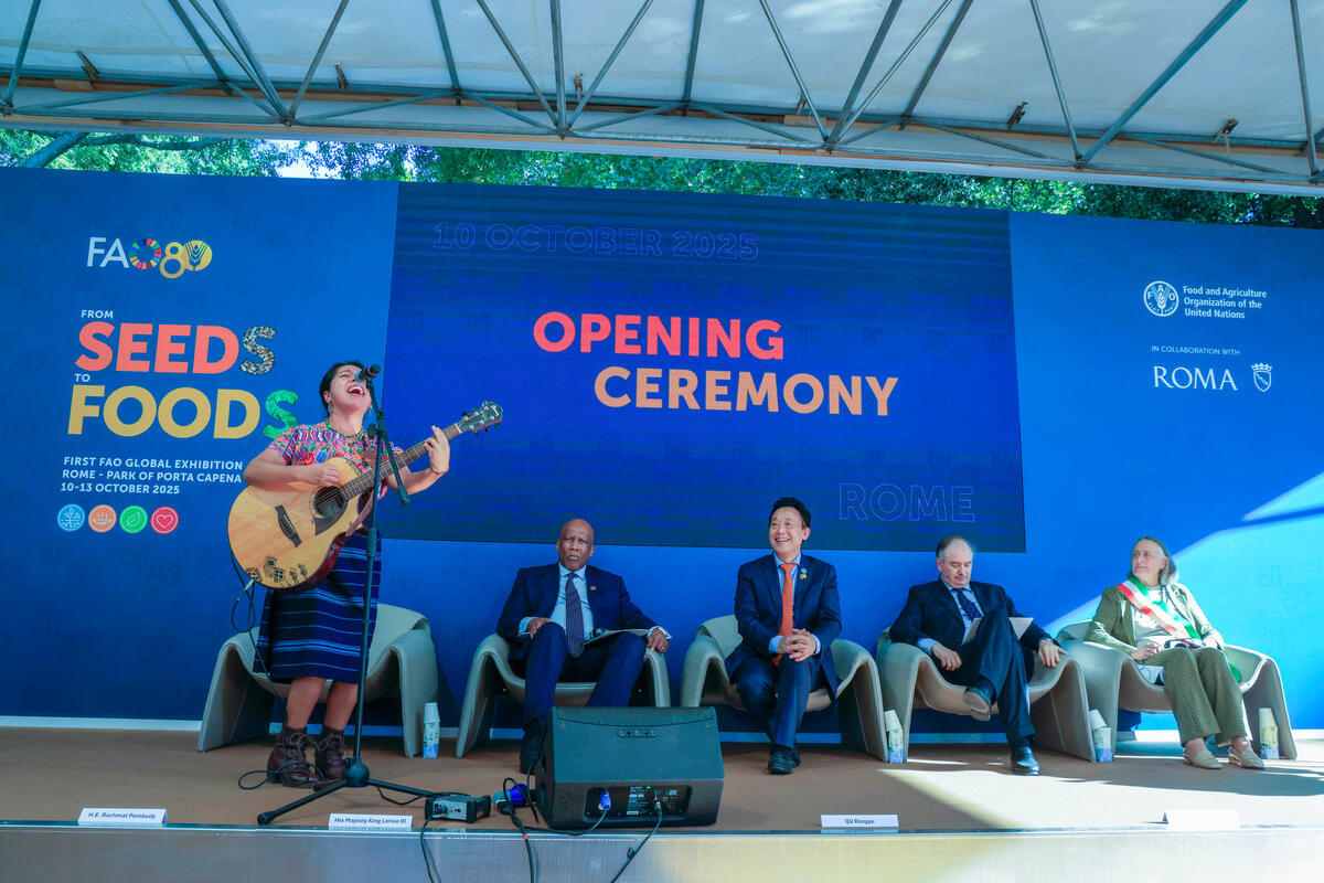 10 October 2025, Rome, Italy. From left to right, Sara Curruchich, 2025 World Food Forum Singer of the Year, His Majesty Letsie III, King of Lesotho, FAO Director-General QU Dongyu, Permanent Representative of Italy to the United Nations Organizations in Rome Bruno Archi. Rome’s Councilor to the Agriculture Development and Waste Cycle Sabrina Alfonsi. High-level opening of the FAO Global Exhibition: From Seeds to Foods. (Porta Capena Park). World Food Forum (WFF) 2025. The fifth edition of the World Food Forum (WFF), the largest annual gathering of agrifood systems stakeholders globally, runs at FAO headquarters in Rome from 10 to 17 October 2025.