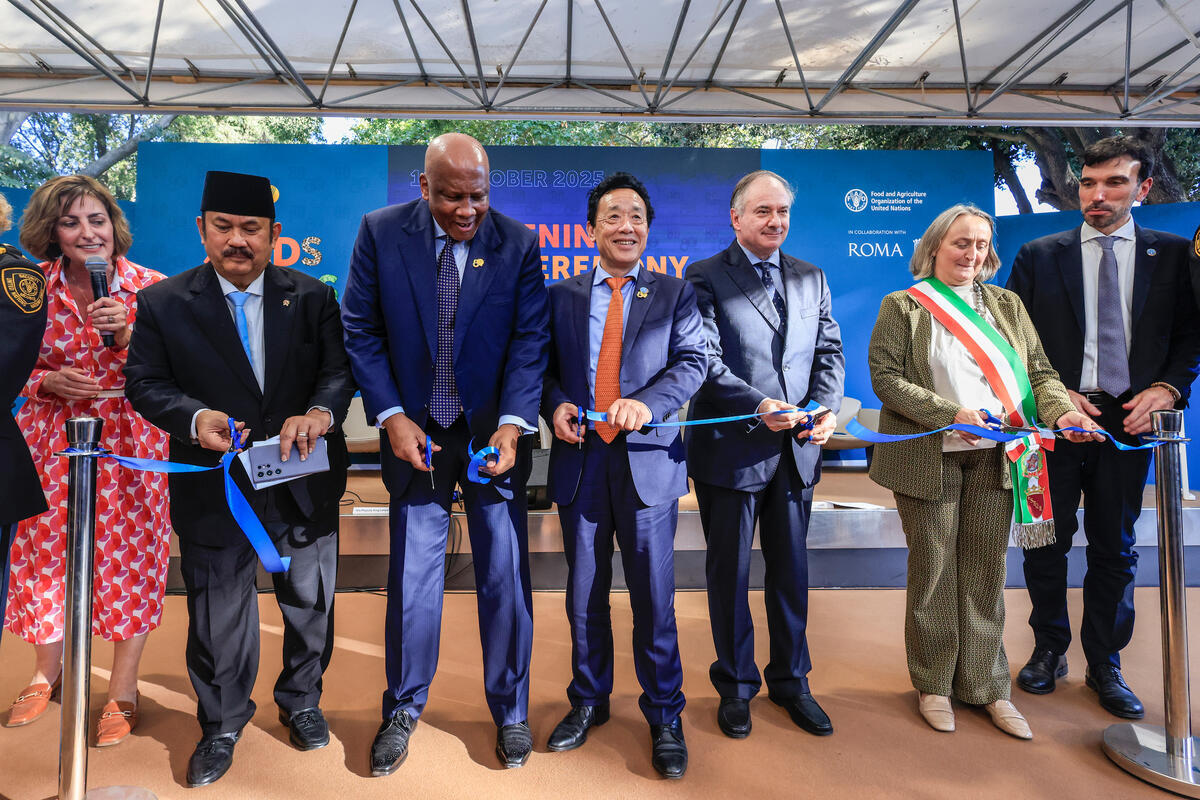 10 October 2025, Rome, Italy. From left to right: FAO’s Deputy Director-General Beth Bechdol, Indonesia’s Minister for National Development Planning Rachmat Pambudy, Lesotho’s King Letsie III, FAO Director-General QU Dongyu, Permanent Representative of Italy to the United Nations Organizations in Rome Bruno Archi, Rome’s Councilor to the Agriculture Development and Waste Cycle Sabrina Alfonsi, FAO’s Deputy Director-General Maurizio Martina. High-level opening of the FAO Global Exhibition: From Seeds to Foods. (Porta Capena Park). World Food Forum (WFF) 2025. The fifth edition of the World Food Forum (WFF), the largest annual gathering of agrifood systems stakeholders globally, runs at FAO headquarters in Rome from 10 to 17 October 2025.