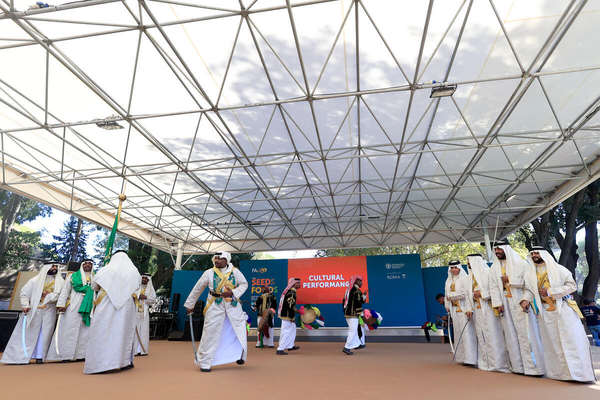 11 October 2025, Rome, Italy. Al-Ardha Saudi Traditional Dance (Saudi Arabia). FAO Global Exhibition: From Seeds to Foods. (Porta Capena Park). World Food Forum (WFF) 2025. The fifth edition of the World Food Forum (WFF), the largest annual gathering of agrifood systems stakeholders globally, runs at FAO headquarters in Rome from 10 to 17 October 2025.