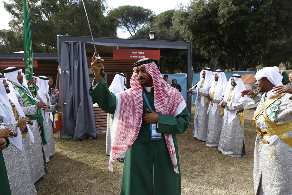 12 October 2025, Rome, Italy. Al-Ardha Saudi Traditional Dance. FAO Global Exhibition: From Seeds to Foods. (Porta Capena Park). World Food Forum (WFF) 2025. The fifth edition of the World Food Forum (WFF), the largest annual gathering of agrifood systems stakeholders globally, runs at FAO headquarters in Rome from 10 to 17 October 2025.