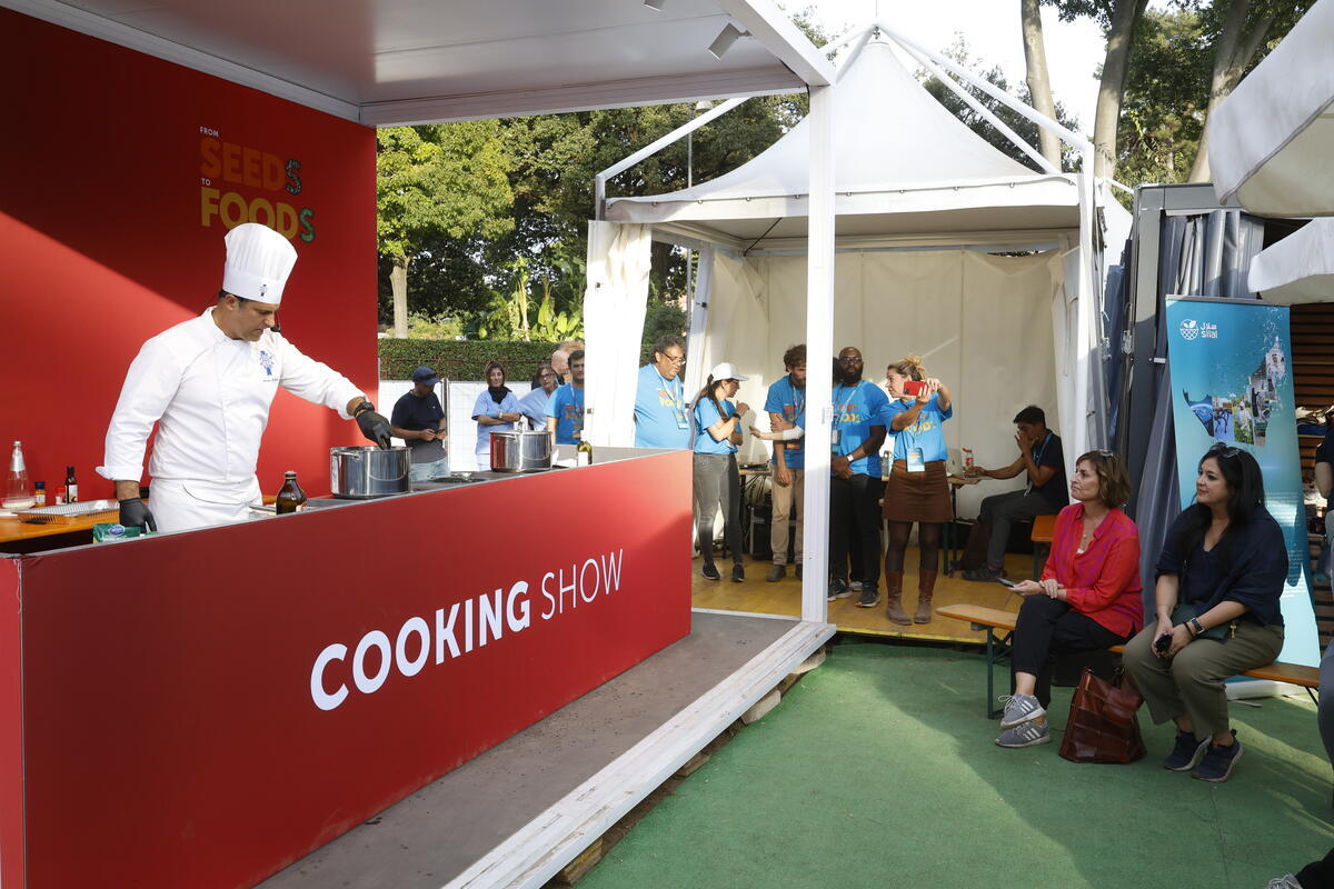 12 October 2025, Rome, Italy. Beth Bechdol, Deputy Director-General of FAO, attends the culinary demonstration led by Chef Andrew Gibbon, Le Cordon Bleu, Peru. FAO Global Exhibition: From Seeds to Foods. (Porta Capena Park). World Food Forum (WFF) 2025. The fifth edition of the World Food Forum (WFF), the largest annual gathering of agrifood systems stakeholders globally, runs at FAO headquarters in Rome from 10 to 17 October 2025.