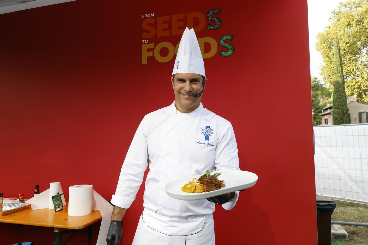 12 October 2025, Rome, Italy. Adobo & DO Pallares: A Mochica-Inspired Feast - a culinary demonstration that explores the dialogue between Andean and Mochica heritage led by Chef Andrew Gibbon, Le Cordon Bleu, Peru. FAO Global Exhibition: From Seeds to Foods. (Porta Capena Park). World Food Forum (WFF) 2025. The fifth edition of the World Food Forum (WFF), the largest annual gathering of agrifood systems stakeholders globally, runs at FAO headquarters in Rome from 10 to 17 October 2025.