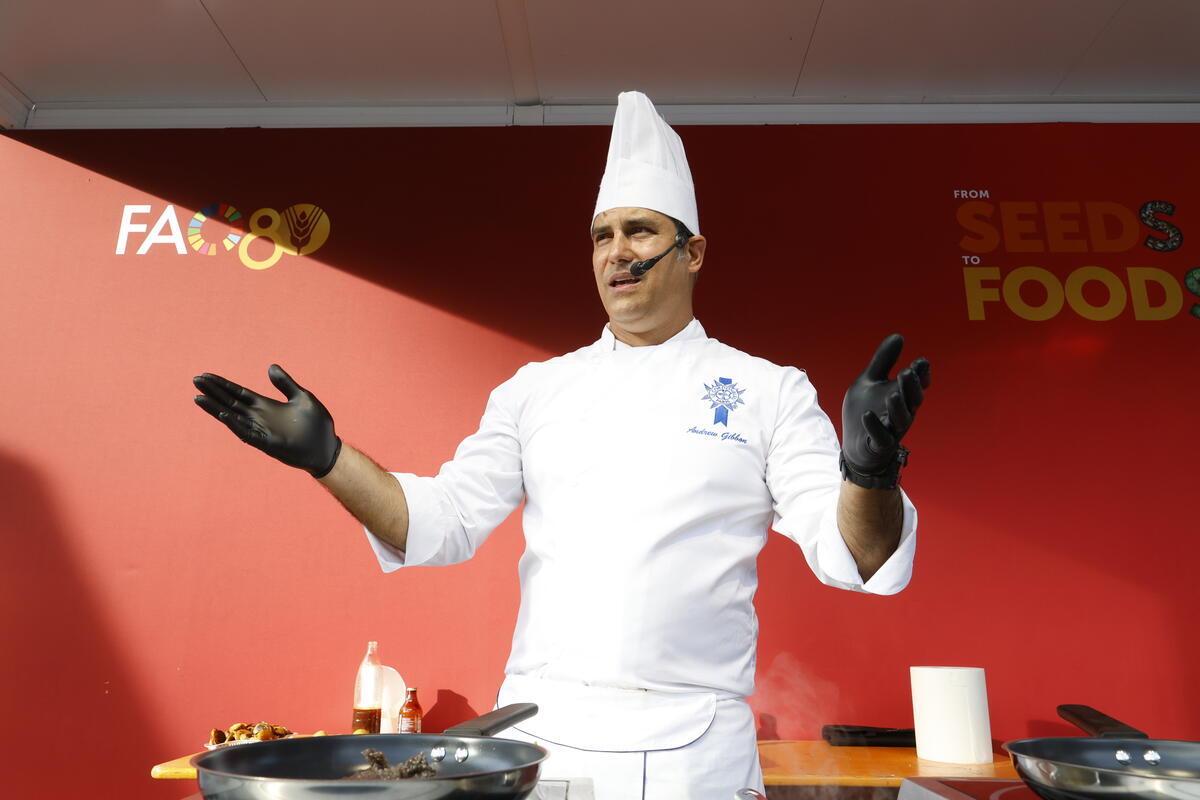 12 October 2025, Rome, Italy. Adobo & DO Pallares: A Mochica-Inspired Feast - a culinary demonstration that explores the dialogue between Andean and Mochica heritage led by Chef Andrew Gibbon, Le Cordon Bleu, Peru. FAO Global Exhibition: From Seeds to Foods. (Porta Capena Park). World Food Forum (WFF) 2025. The fifth edition of the World Food Forum (WFF), the largest annual gathering of agrifood systems stakeholders globally, runs at FAO headquarters in Rome from 10 to 17 October 2025.