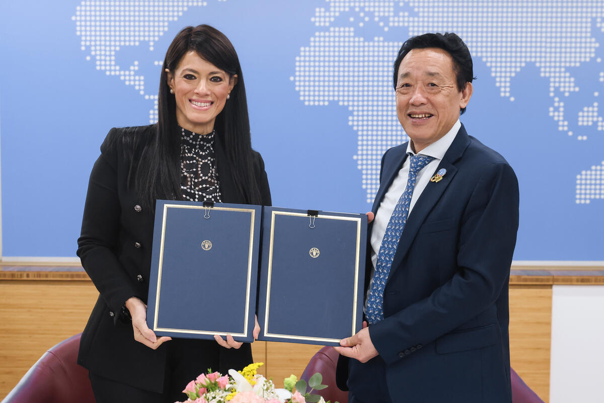 13 October 2025, Rome, Italy. FAO Director-General QU Dongyu (R) and Egypt Minister for Planning, Economic Development and International Cooperation (MOIC) Rania Al-Mashat (L) sign a letter of intent between the Food and Agriculture Organisation of the United Nations and the Ministry for Planning, Economic Development and International Cooperation (MOIC). FAO Headquarters. (Iraq room).