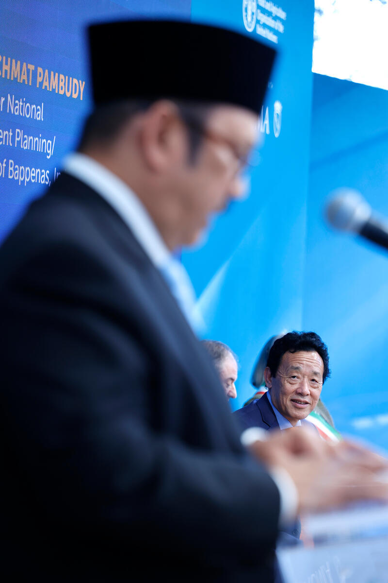 10 October 2025, Rome, Italy. FAO Director-General QU Dongyu look at Indonesia Minister for National Development Planning/Chairman of BAPPENAS Rachmat Pambudy, delivering his address during the opening ceremony of the FAO Global Exhibition: From Seeds to Foods. (Porta Capena Park). World Food Forum (WFF) 2025. The fifth edition of the World Food Forum (WFF), the largest annual gathering of agrifood systems stakeholders globally, runs at FAO headquarters in Rome from 10 to 17 October 2025.