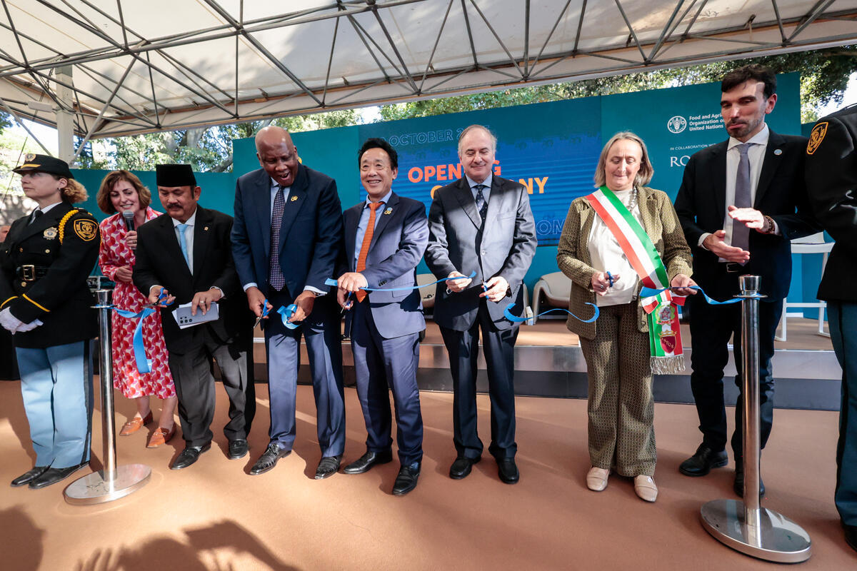 10 October 2025, Rome, Italy. FAO Director-General QU Dongyu (C) Beth Bechdol, Deputy Director-General, FAO (L), H.E. Rachmat Pambudy, Minister for National Development Planning - Chairman of Bappenas, Indonesia (2L), His Majesty King Letsie III, the Kingdom of Lesotho (3L) Sabrina Alfonsi, Councillor for Agriculture, Environment and Waste Management of Rome (6L) Maurizio Martina, Deputy Director-General, FAO (7L) at the opening ceremony of the FAO Global Exhibition: From Seeds to Foods. (Porta Capena Park). World Food Forum (WFF) 2025. The fifth edition of the World Food Forum (WFF), the largest annual gathering of global agri-food system stakeholders, will be held at FAO Headquarters in Rome from 10 to 17 October 2025.