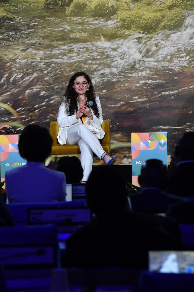 13 october 2025. FAO Headquarters, Rome, Italy. Kenza Bouzoubaa - WFF, Young Scientist group member delivers his address during the Grand Opening at the World Food Forum 2025.
