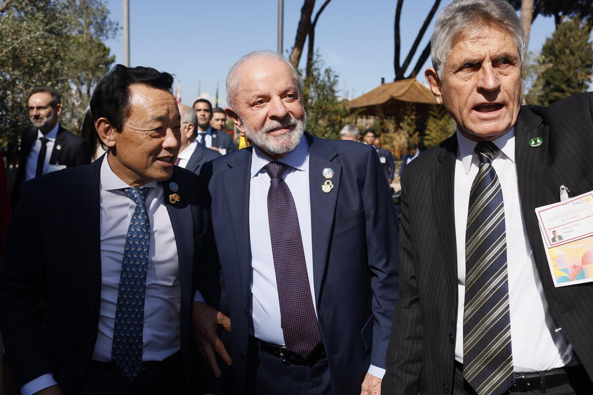 13 October 2025. FAO Headquarters, Rome, Italy. FAO Director-General Qu Dongyu welcomes Luiz Inácio Lula da Silva, President of Brazil, upon his arrival at the World Food Forum 2025.