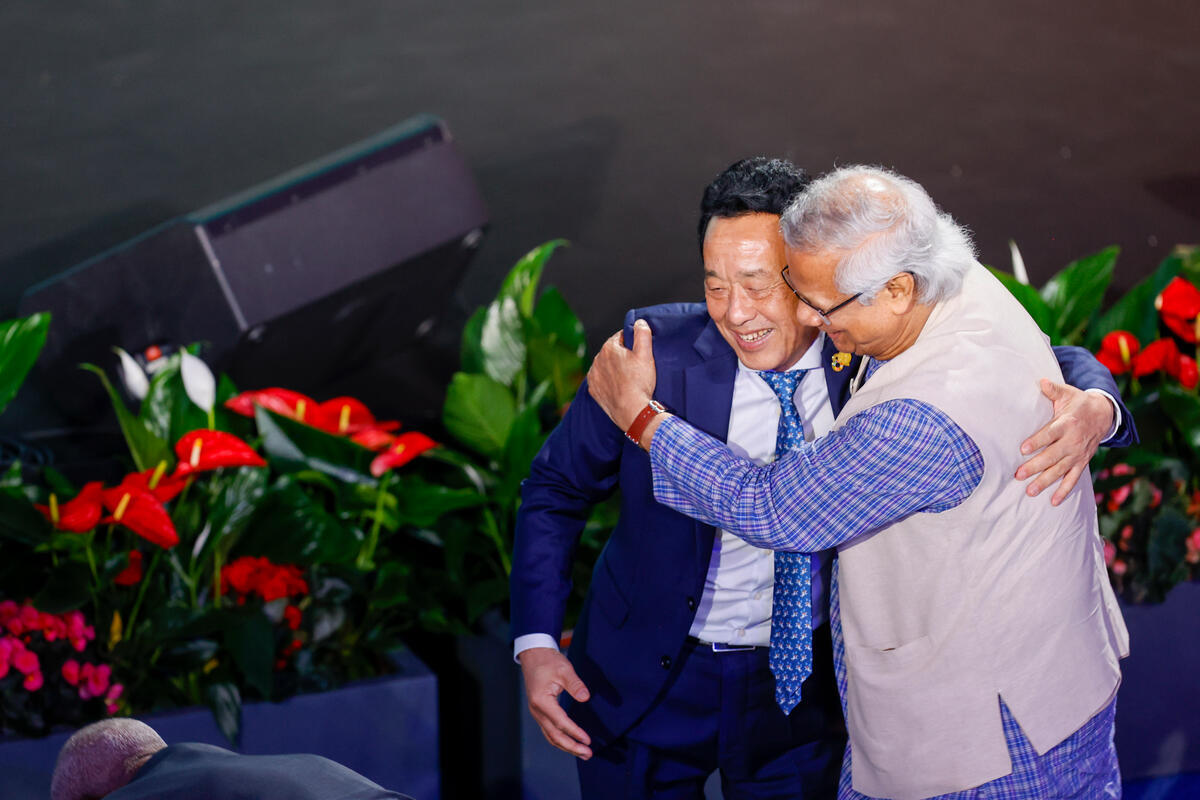 13 October 2025. FAO Headquarters, Rome, Italy. Muhammad Yunus (R), Chief Adviser of the interim Government of the People’s Republic of Bangladesh, greets FAO Director-General QU Dongyu (L) during the Grand Opening of the World Food Forum (WFF) 2025. The fifth edition of the World Food Forum (WFF), the largest annual gathering of agrifood systems stakeholders globally, runs at FAO headquarters in Rome from 10 to 17 October 2025.