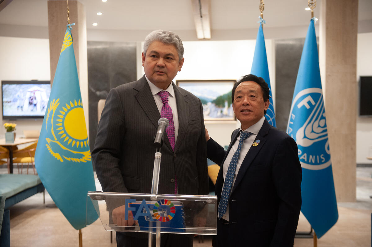 13 October 2025, Rome, Italy. FAO Director-General QU Dongyu (R) and Kazakhstan Minister for Foreign Affairs Yermek Kosherbayev inaugurate the new Kazakhstan Lounge. FAO Headquarters. (Kazakhstan Lounge)