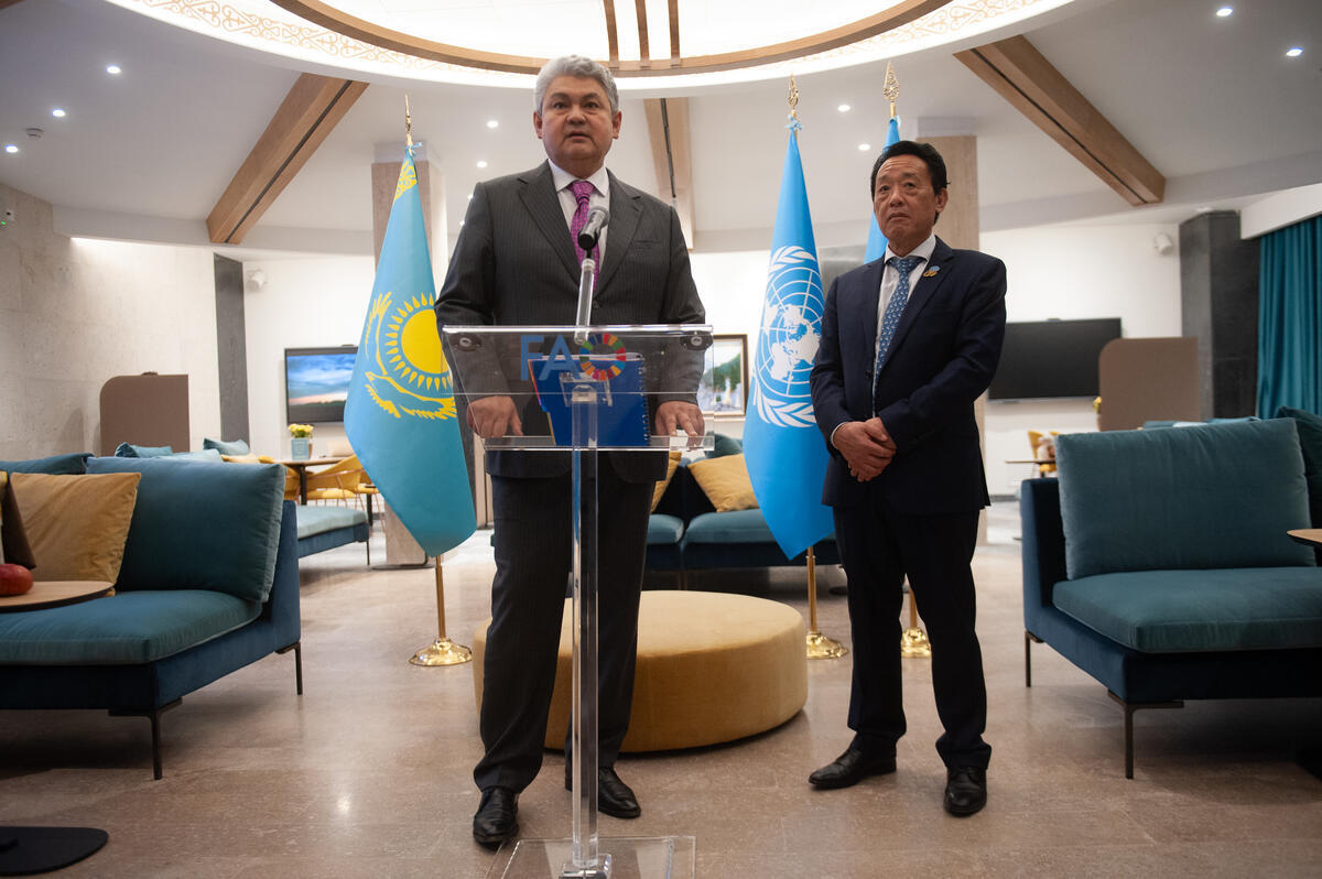 13 October 2025, Rome, Italy. FAO Director-General QU Dongyu (R) and Kazakhstan Minister for Foreign Affairs Yermek Kosherbayev inaugurate the new Kazakhstan Lounge. FAO Headquarters. (Kazakhstan Lounge)