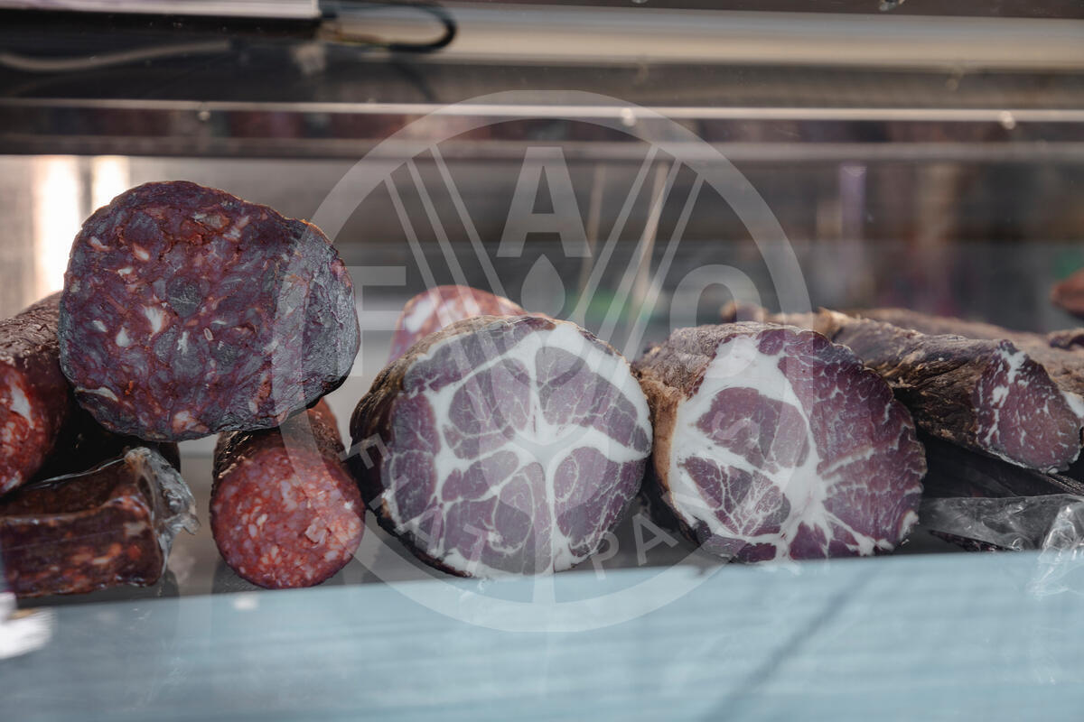 28 July 2025, Belgrade, Republic of Serbia. Cured meats at the open market in Zemun.