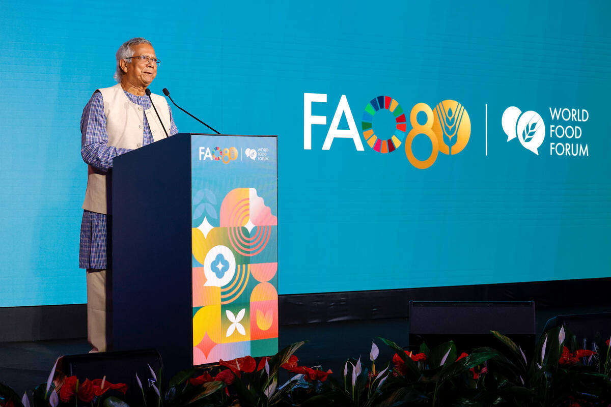 13 October 2025, Rome, Italy. Muhammad Yunus, Chief Adviser of the interim Government of the People’s Republic of Bangladesh, delivers his address during the World Food Forum (WFF) 2025 Grand Opening. The fifth edition of the World Food Forum (WFF), the largest annual gathering of agrifood systems stakeholders globally, runs at FAO headquarters in Rome from 10 to 17 October 2025. FAO Headquarters (Plenary Hall).