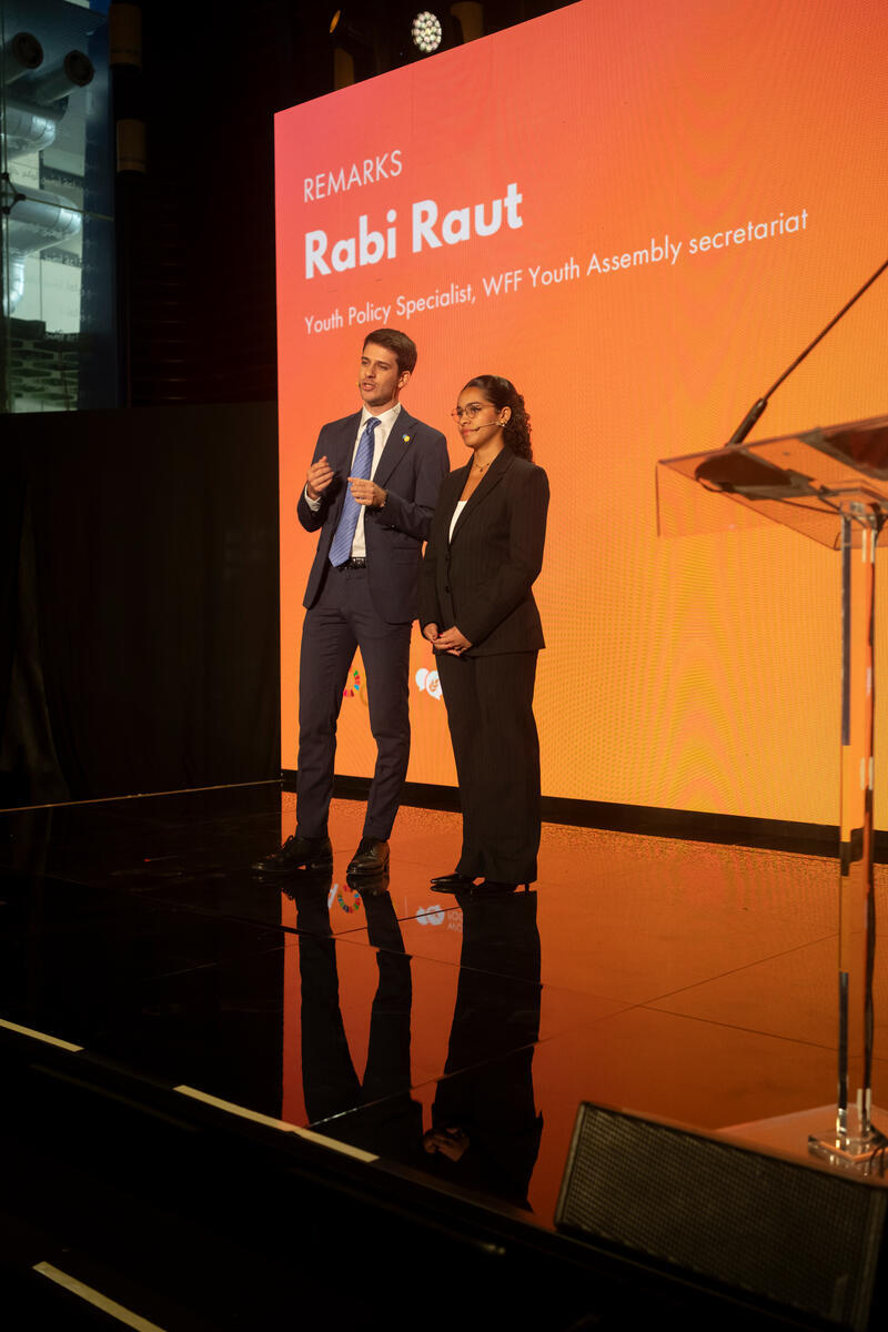 14 October 2025. FAO Headquarters, Rome, Italy. Andrea Granata (on the left) and Zineb Amine (on the right) moderate the event From Policy to Action: Youth shaping global agrifood systems