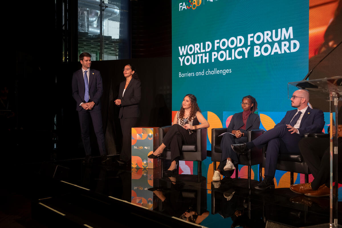 14 October 2025. FAO Headquarters, Rome, Italy. In the WFF Youth Policy Board Member, from left to right, the two moderators Andrea Granata and Zineb Amine, with the speakers Valeria Morales (thematic Lead for Nutrition), Tokelo Shai (thematic Lead for Bioeconomy), Alexandros Tataridas (thematic Lead for Biodiversity) and Chevaughn Brown (thematic Lead for Fisheries and Aquaculture) during From Policy to Action: Youth shaping global agrifood systems.