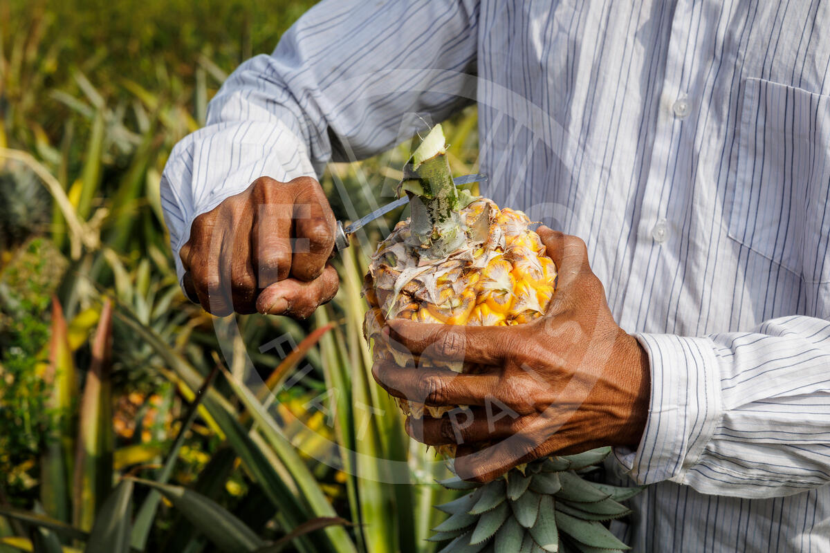 SRI LANKA, 2025. Slicing freshly harvested pineapple