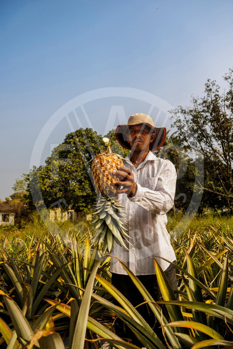 SRI LANKA, 2025. Farm worker holds just-picked pineapple
