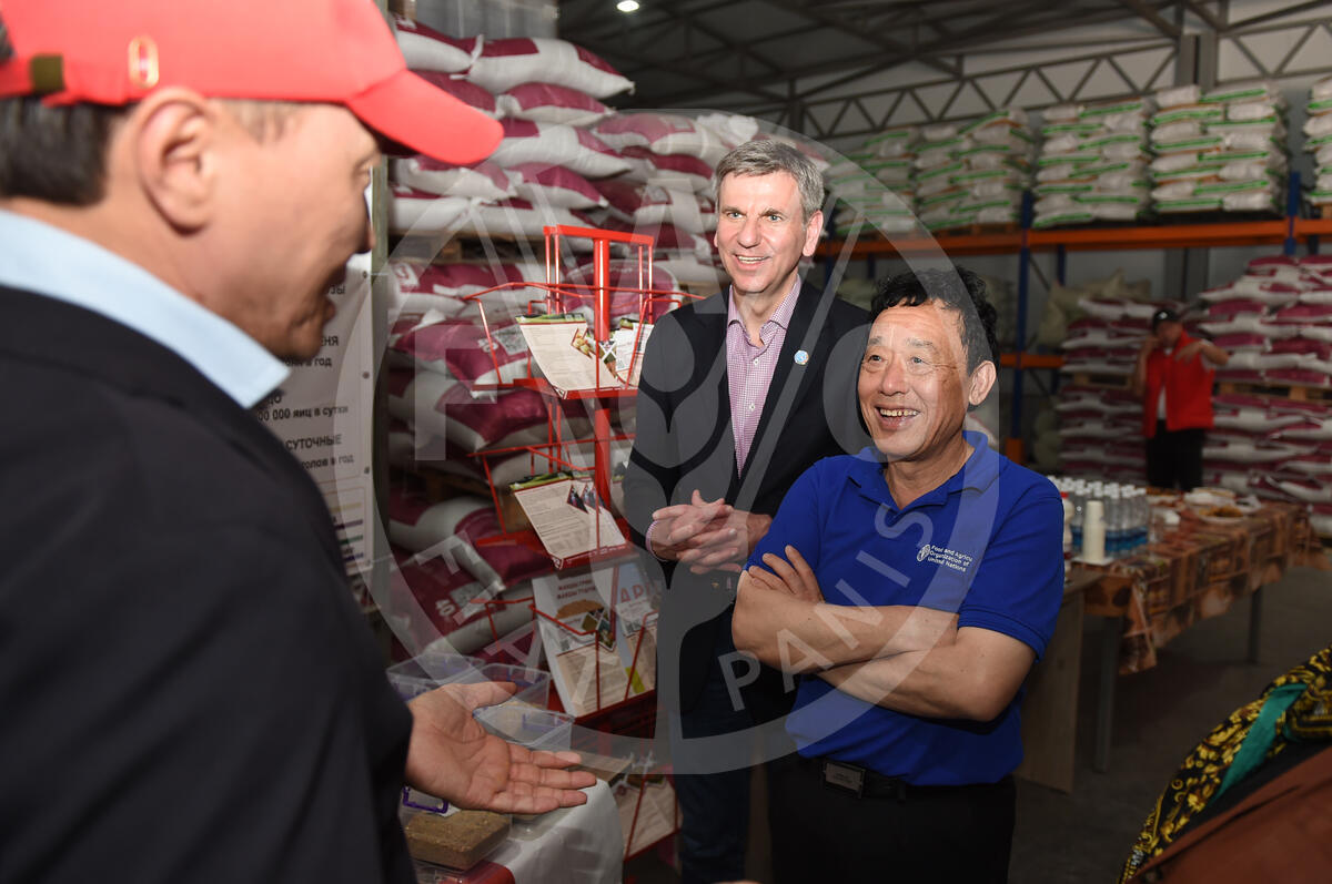 26 April 2025. Chui Oblast, Kyrgyzstan. FAO Director-General QU Dongyu (R) and Regional Representative for Europe and Central Asia Viorel Gutu (C) met with Turatbek Ukubaev (L), founder and CEO of Atalyk Group, for a visit and supervision of compound feed production.