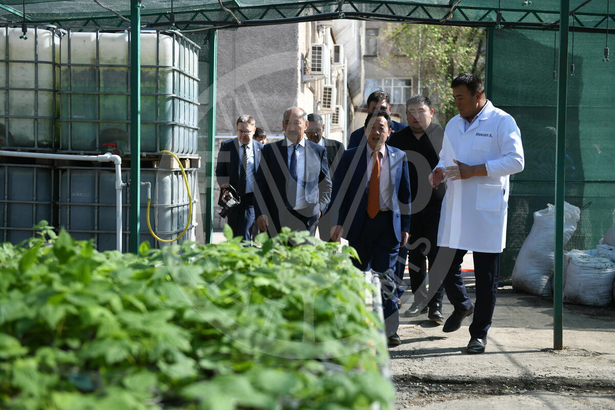 25 April 2025. Bishkek, Kyrgyzstan. FAO Director-General QU Dongyu (C) visits the Science and Production Laboratory of the National Agrarian University in Bishkek accompanied by Rysbek Nurgaziev (L), Rector of the Kyrgyz National Agricultural University.