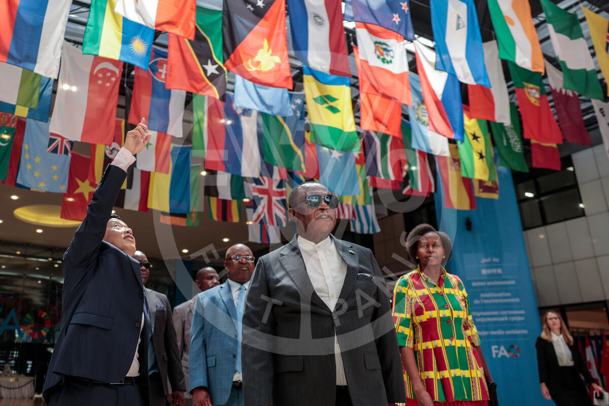 02 May 2025. Rome, Italy. FAO Director-General QU Dongyu (L) with Zimbabwe Vice-President Constantino Guveya Dominic Nyikadzino Chiwenga (R) visit FAO Headquarters, (Atrium).