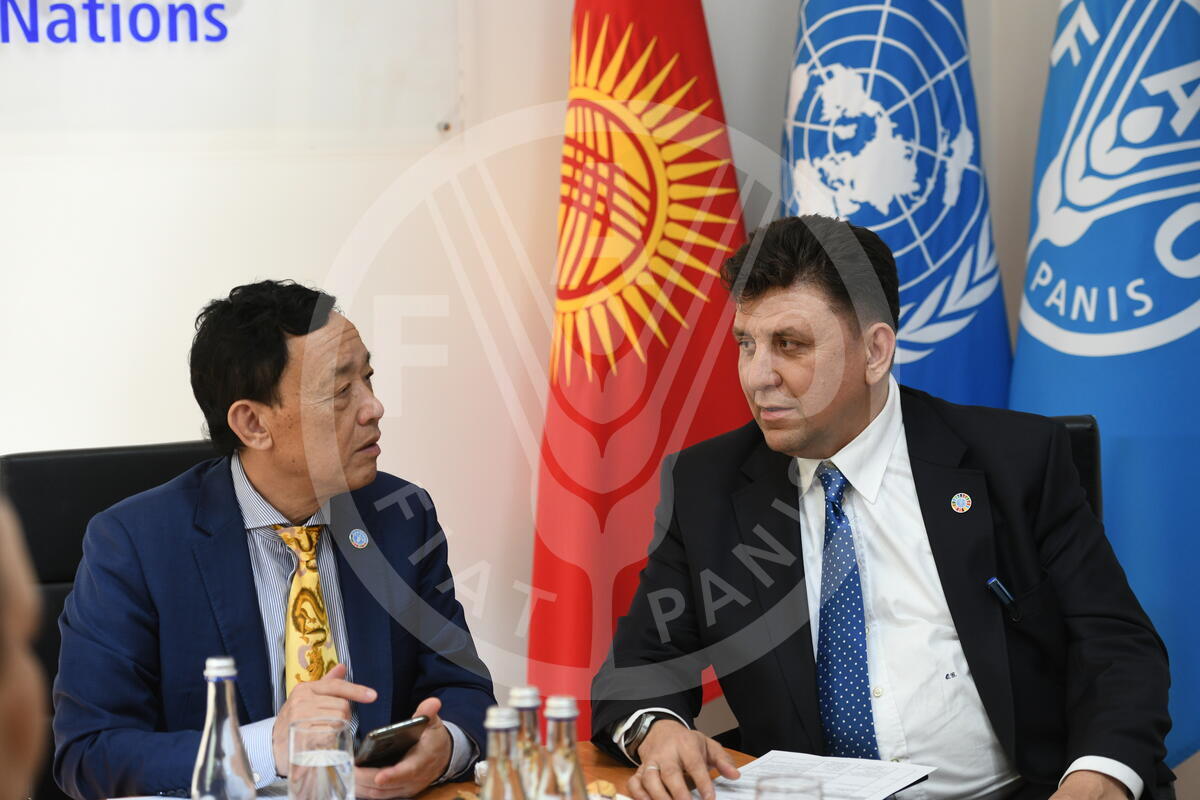 24 April 2025. Bishkek, Kyrgyzstan. FAO Director-General QU Dongyu (L) with Oleg Guchgeldyev (R), FAO Representative in Kyrgyzstan during a meeting at FAO Representation office in Bishkek.