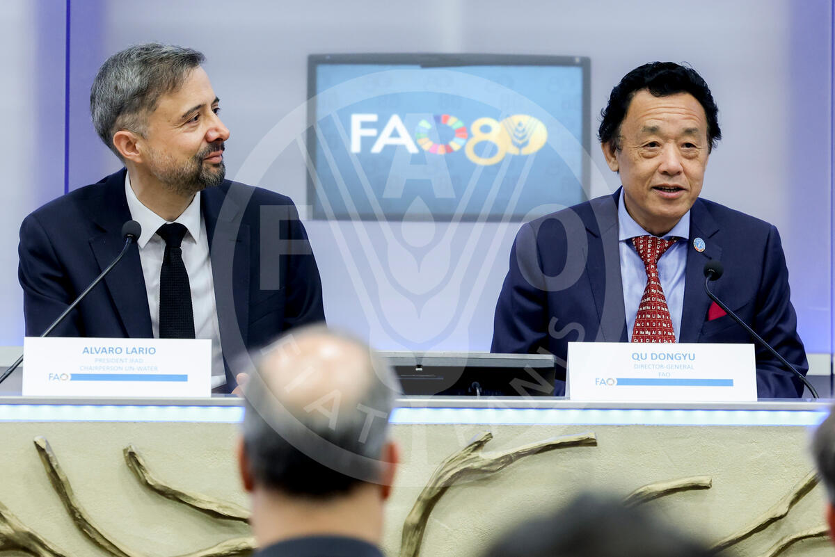 04 April 2025, Rome Italy. FAO Director-General QU Dongyu (R) delivers his remarks during the celebration of AQUASTAT's 30th anniversary and Joint FAO and UN-Water Briefing on the UN System-wide Strategy on Water and Sanitation. FAO Headquarters (Sheikh Zayed Centre).