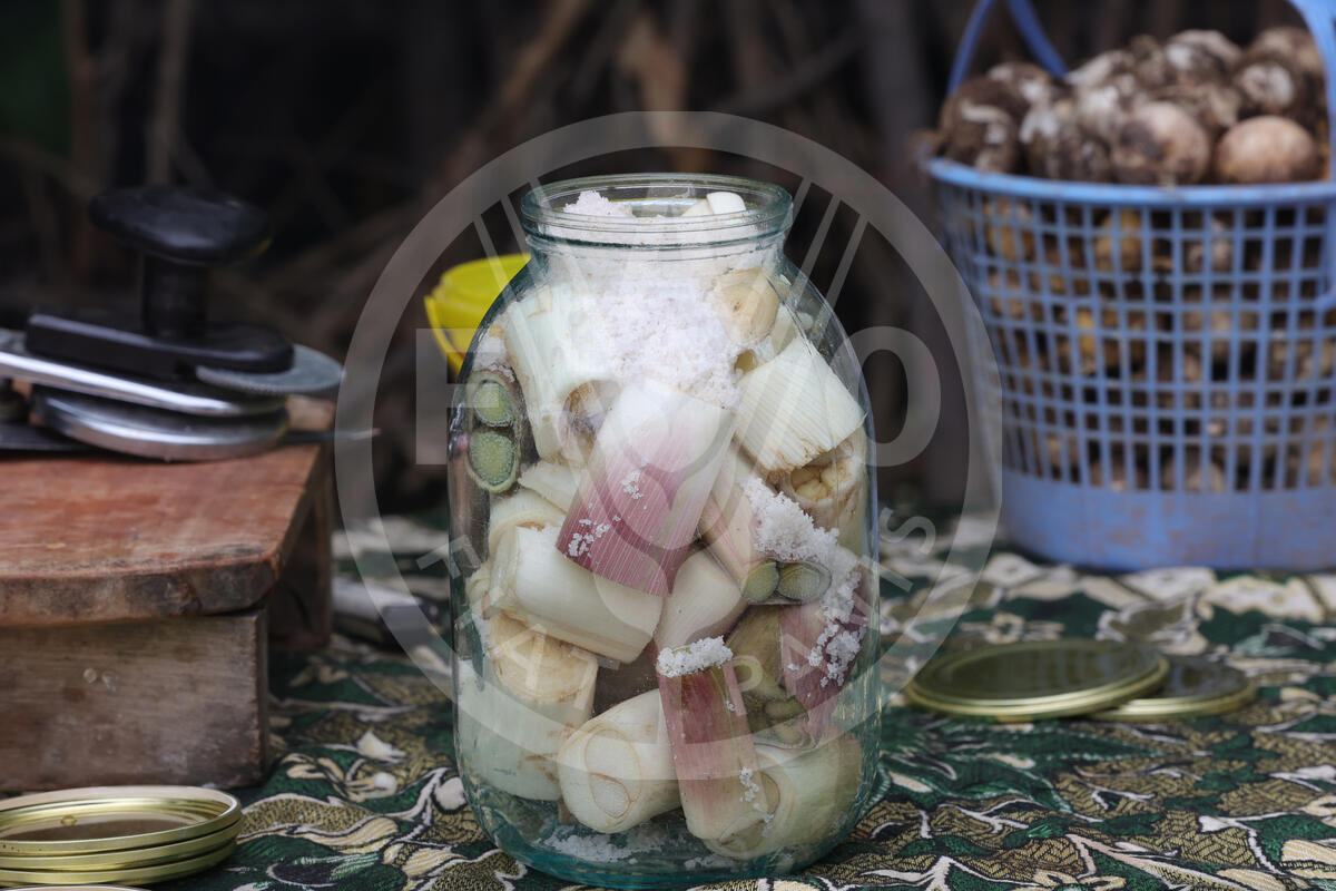 Glass jar filled with chopped rhubarb and salt, prepared for fermentation using a traditional pickling method.