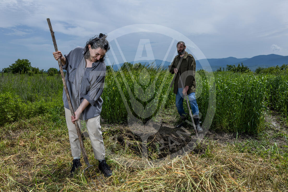 May 2025, Zemo Alvani, Georgia — Farmers Natia Mathcharashvili (left) and Shota Lagazidze work in their fields in their Zemo Alvani farm, Georgia. Natia and Shota are supported by the Benefit-sharing Fund, the operational mechanism of the International Treaty on Plant Genetic Resources for Food and Agriculture (ITPGRFA), which facilitates international cooperation on plant genetic resources.