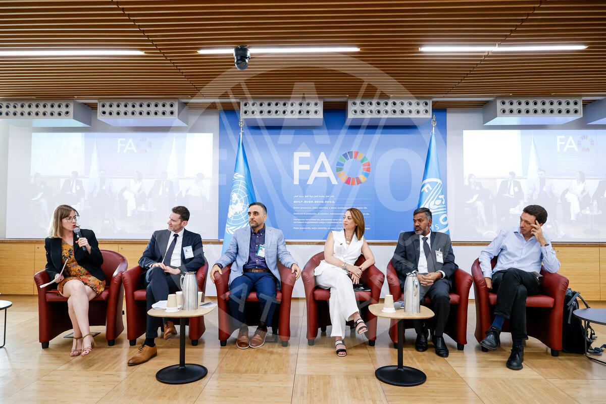 09 July 2025. Rome, Italy. (L-R) Anne-Christelle Ott, Economist, FAO Investment Centre; Lionel Dieu, Fund Manager of AgriFi, Brussels, Belgium; Mohammad Hossein Jarrahi, Professor, University of North Carolina, Chapel Hill, USA; Thouraya Triki, Director International Partners, EIB Global, European Investment Bank (EIB), Luxembourg, Luxembourg; Paulrasu Chellamuthu, Secretary for Horticulture and Agriculture Departments, Government of Himachal Pradesh Shimla, India; Christophe Alliot, Co-founder and Head of Research, BASIC, Paris, France. Session 2.1: Investing In Jobs Through Value Addition: The Power Of Innovation And Finance. Thirteenth edition of Investment Days 2025. FAO headquarters (Iraq room).