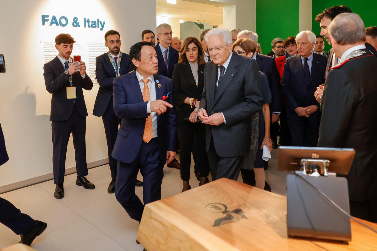 16 October 2025, Rome, Italy. FAO Director-General QU Dongyu (L) next to President of the Italian Republic, Sergio Mattarella (C), points at a wooden table donated by the Italian Carabinieri, during their visit to the Food and Agriculture Museum & Network (FAO MuNe). FAO World Food Day Global ceremony and 80th Anniversary celebration. This year’s World Food Day coincides with FAO’s 80th anniversary, reflecting decades of work to boost food production, reduce poverty, and respond to crises. FAO Headquarters.