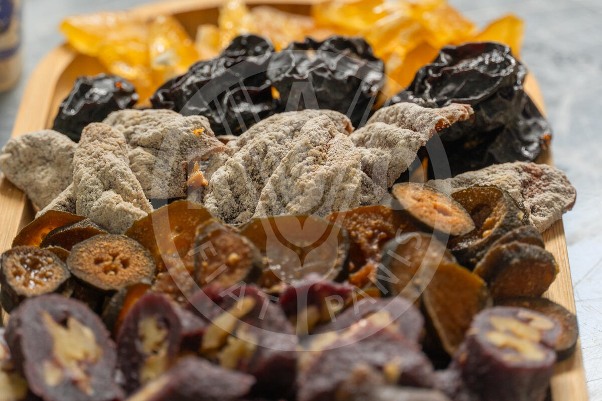 Churckhela and dried fruits made by a smallholder woman farmer and small business owner. The dried fruits depicted in the shot include feijoa, persimmon, and plum.