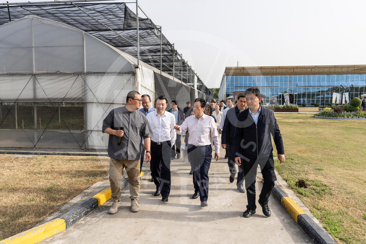 24 March 2025. Nanjing, China. FAO Director-General QU Dongyu, flanked by Nanjing Bureau of Agriculture and Rural Affairs Director Zhang Yi (L) and Nanjing Municipality Deputy Party Secretary Li Baiping (R) walks through the Chrysanthemum garden at Hushu Village