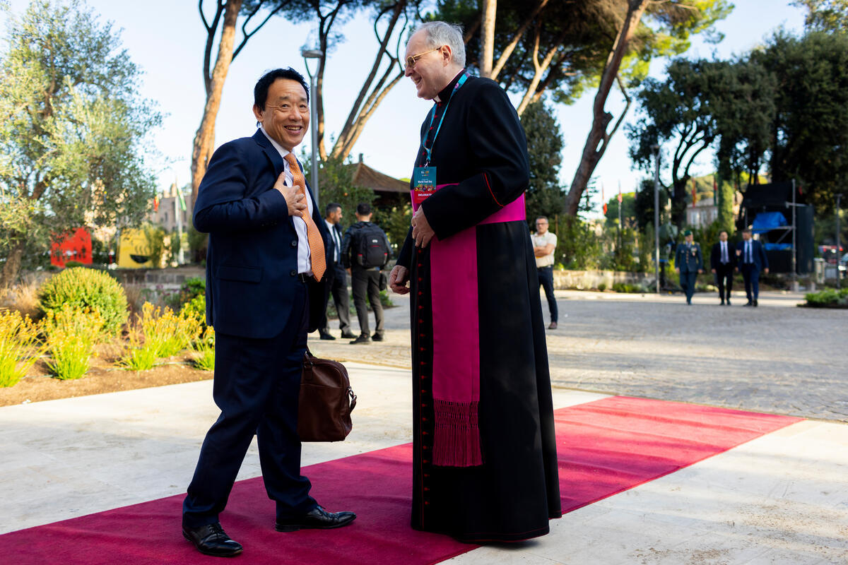 16 October 2025, Rome, Italy. FAO Director-General QU Dongyu (L) welcomes Mons. Fernando Chica Arellano, Permanent Observer of the Holy See. World Food Day Global ceremony and 80th Anniversary celebration. This year’s World Food Day coincides with FAO’s 80th anniversary, reflecting decades of work to boost food production, reduce poverty, and respond to crises. FAO Headquarters.