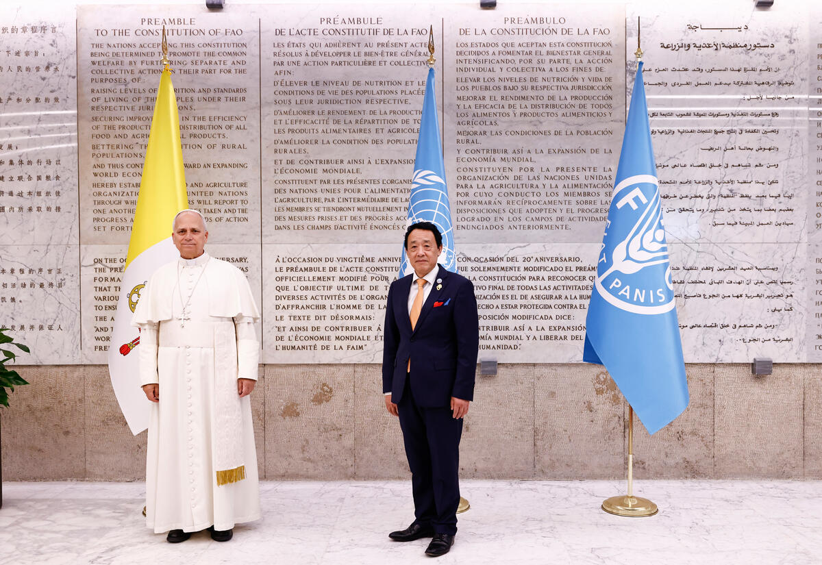 16 October 2025, Rome, Italy. FAO Director-General QU Dongyu welcomes His Holiness Pope Leo XIV. World Food Day Global ceremony and 80th Anniversary celebration. This year’s World Food Day coincides with FAO’s 80th anniversary, reflecting decades of work to boost food production, reduce poverty, and respond to crises. FAO Headquarters.
