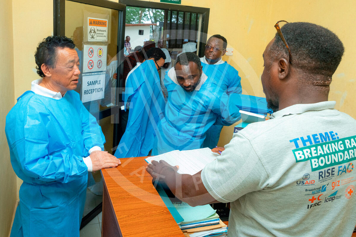 20 July 2025. Makeni, Sierra Leone. FAO Director-General QU Dongyu and Minister of Agriculture Dr. Henry Musa Kpaka wears their PPE at the Central Veterinary Laboratory, Teko, Makeni, Northern Sierra Leone.