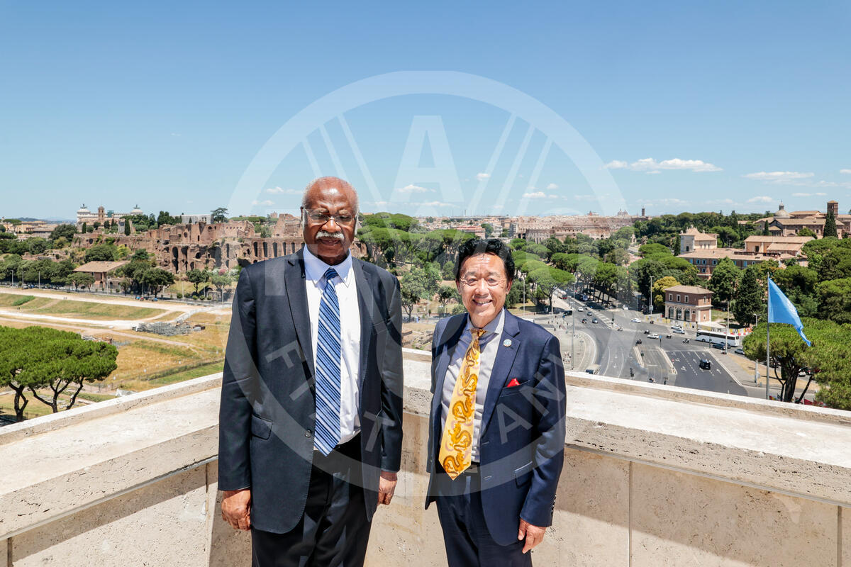 28 June 2025. Rome, Italy. FAO Director-General QU Dongyu (R) pose for a picture on the FAO terrace with Philemon Yang, President of the United Nations General Assembly. FAO Headquarters (Iraq Room).